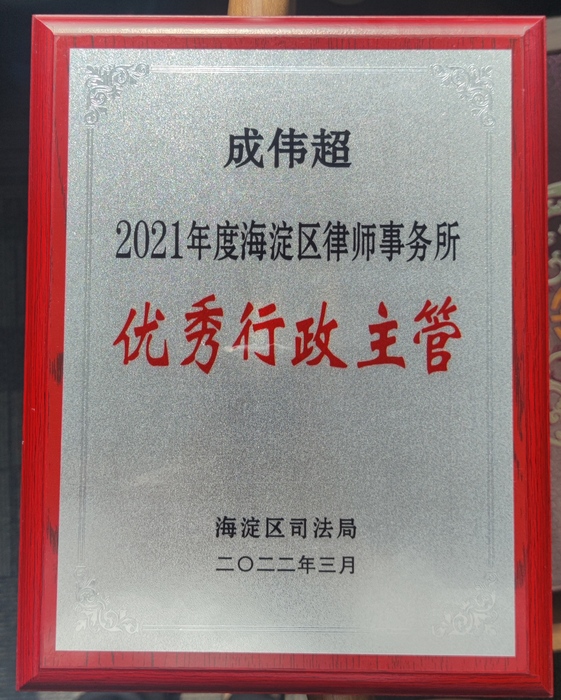 成伟超主管被海淀区司法局评为“2021年度海淀区律师事务所优秀行政主管” - 北京京凯律师事务所【官网】