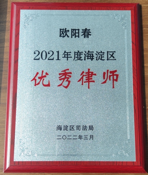 欧阳春律师被海淀区司法局评为“2021年度海淀区优秀律师”